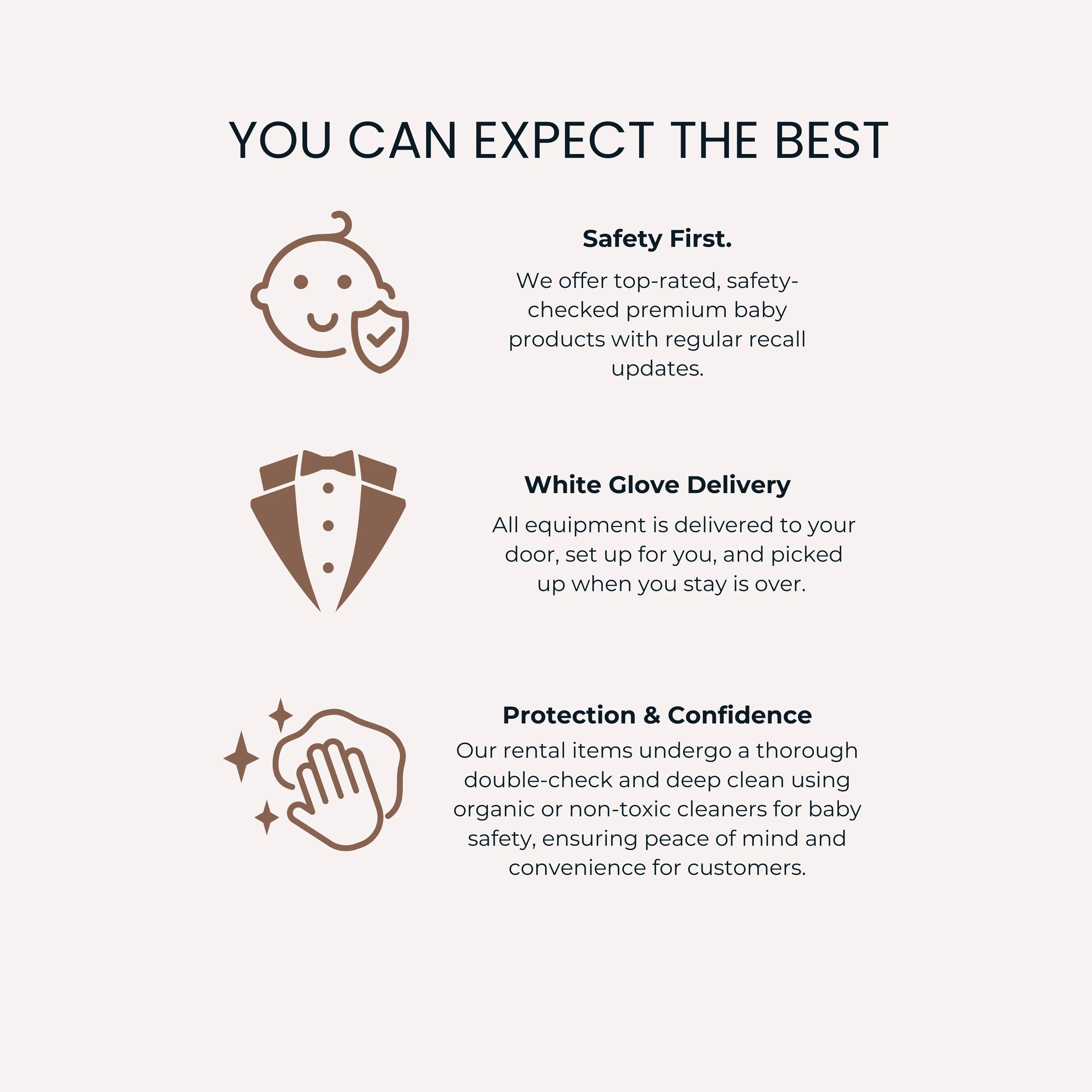 We deliver everything you need right to your Phoenix destination from top brands including UPPAbaby, Britax, Nuna, Viaggio, BOB, Monte Design and more. All items show up sparkling clean & sanitized, safety-checked, and are set up with care.